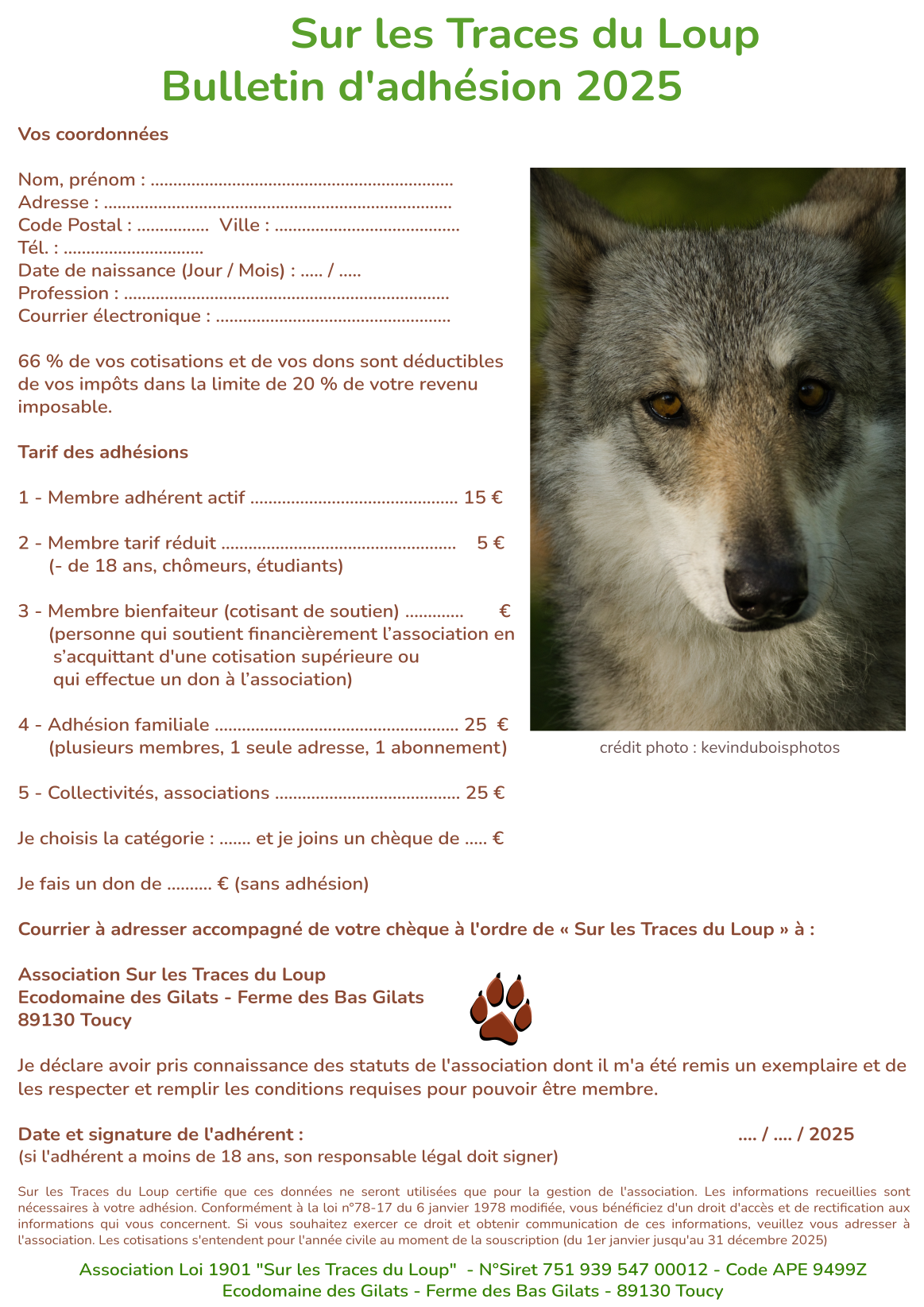 Pour adhérer à l’association « Sur les traces du loup », vous pouvez adhérer en ligne (dans la colonne de droite) ou via le Bulletin d’adhésion 2025. Vous pourrez ainsi recevoir nos newsletters et être tenu au courant des différents événements au cours de l’année.